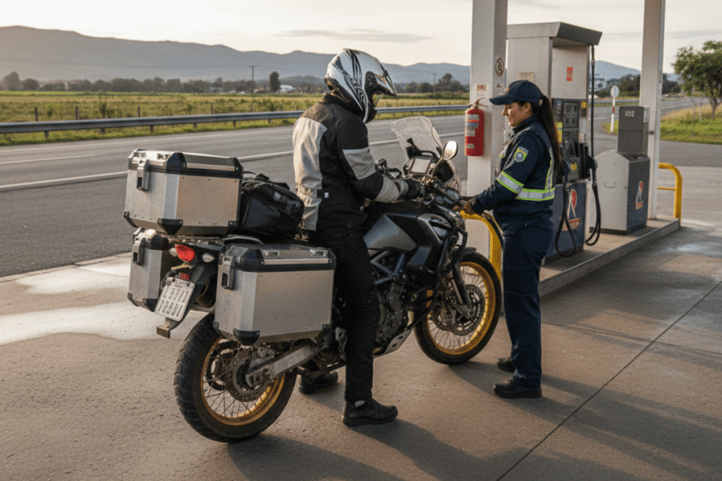Abasteça sempre que encontrar um posto de confiança, mesmo que ainda tenha combustível. Tenha em mente o consumo médio da sua moto para calcular a autonomia restante. Sempre tenha dinheiro em espécie, para casos em que não tenha sinal para pagamento em cartão ou pix.